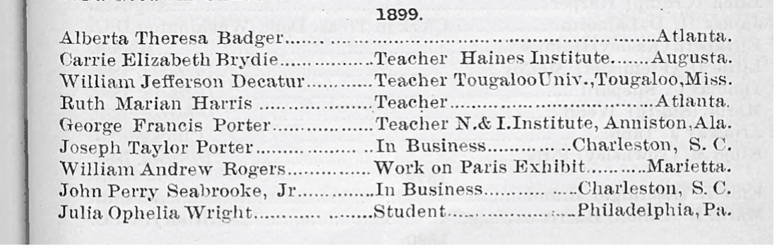 Scanning the page which records the earliest graduates of Atlanta University provides fleeting glimpses into their lives. (1) William Henry Crogman, class of 1876, stayed in Atlanta to become a professor at Clark University. (2) Samuel Benjamin Morse moved to Savannah, 250 miles away on the Georgia coast, to become a music teacher. (3) London Humes Waters was deceased.