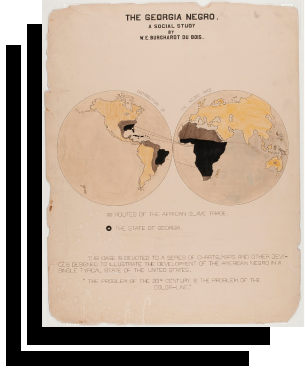 Although most of 63 charts that Du Bois and his students created for the Paris Exhibition were displayed on the countertops, available for visitors to peruse in any order they chose, the charts were conceived as two distinct sets. The first, The Georgia Negro: A Sociological Study, focused on statistics that had been compiled by Du Bois and his students that related to the Black population of that state. The second was national in scope. Entitled A Series of Statistical Charts Illustrating the Condition of the Descendants of Former Slaves Now in Residence in the United States of America, this set drew from several data sources, including the US Census, in order to put the Black population of the United States in national and international perspectives.